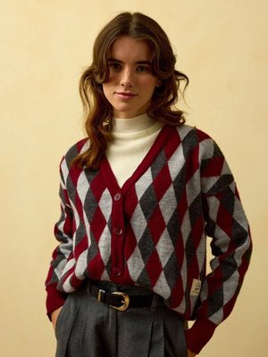 Ceylan Otantik Bordo Baklava Desenli Triko Hırka