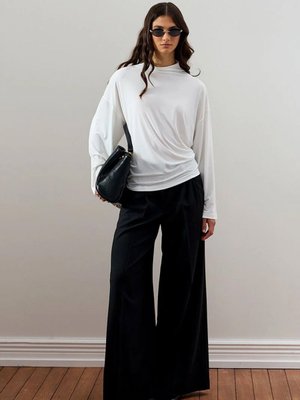 Ceylan Otantik Jarse Bluz & Acı Kahve Pile Detay Palazzo Pantolon Siyah Beyaz