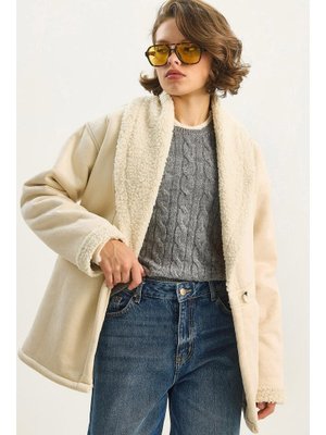 Bianco Lucci Krem İçi Kürklü Cep Detaylı Şal Yaka Süet Kaban