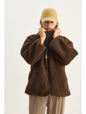 Bianco Lucci Acı Kahve Cep Detaylı Fermuarlı Astarlı Dik Yaka Peluş Mont