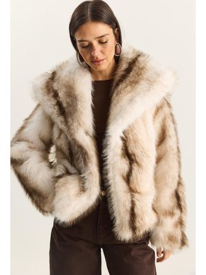 Bianco Lucci Krem Vizon Desenli Geniş Yakalı Astarlı Suni Kürk Kaban