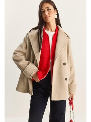 Bianco Lucci Bej Kruvaze Yaka Astarlı Kısa Oversize Kaşe Kaban