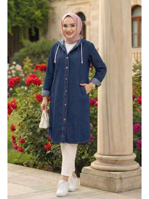 Harmatime butik Kapüşonlu, Düğmeli Ve Uzun Lacivert Kot Ceket