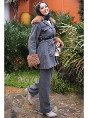 İmaj Butik Füme Kol Yaka Kürklü Kot Ceket Pantolonlu Takım