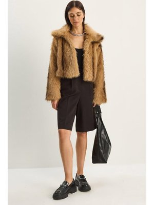 Bianco Lucci Camel Kahverengi Desenli Yakalı Astarlı Suni Crop Kürk Ceket