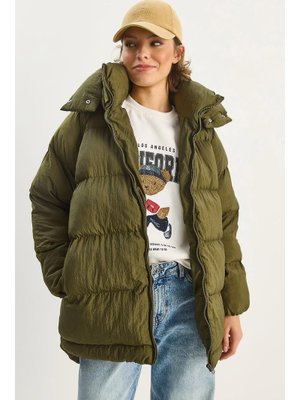 Bianco Lucci Haki Kapüşonlu Cep Detaylı Astarlı Oversize Krinkıl Şişme Mont