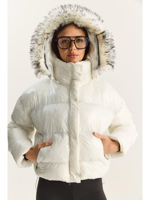 Bianco Lucci Beyaz Cep Detaylı Astarlı Kapüşonlu Kısa Puffer Mont