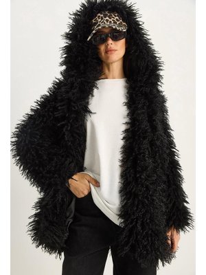 Bianco Lucci Siyah Çift Düğme Detaylı Kapüşonlu Astarlı Tibet Kaban