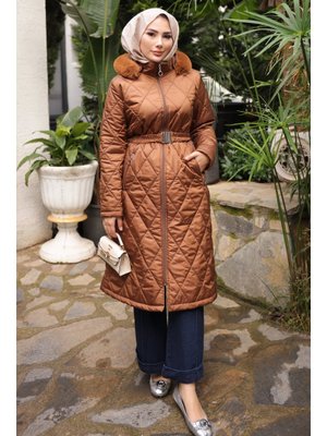 İmaj Butik Taba Kapüşonlu Fermuarlı Kapitone Mont
