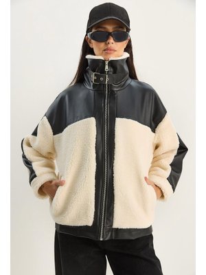 Bianco Lucci Krem Siyah Deri Garnili Astarlı Cep Detaylı Peluş Mont