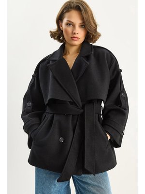 Bianco Lucci Siyah Apolet Detaylı Astarlı Kuşaklı Cepli Kısa Kaşe Kaban