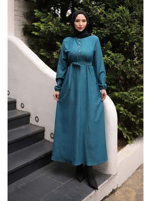 İmaj Butik Petrol Yeşili Kuşaklı Kol Lastikli Fitilli Elbise