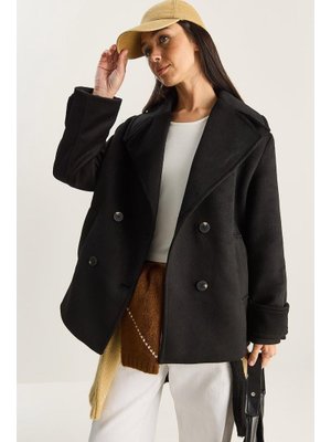 Bianco Lucci Siyah Kruvaze Yaka Astarlı Kısa Oversize Kaşe Kaban
