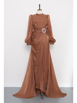 İmaj Butik Kahverengi Önü Taş Detaylı Abiye Elbise