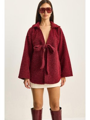 Bianco Lucci Bordo Gömlek Yaka Bağlama Detaylı Kırçıllı Kaşe Kaban