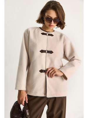 Bianco Lucci Taş Deri Toka Detaylı Astarlı Yün Dokulu Kısa Kaban
