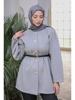 İmaj Butik Gri Bel Lastikli Kemerli Kaşe Çeket