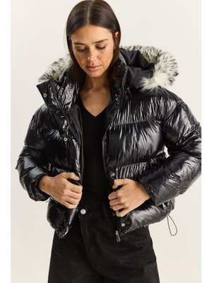 Bianco Lucci Siyah Cep Detaylı Astarlı Kapüşonlu Kısa Puffer Mont
