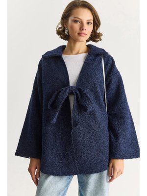 Bianco Lucci İndigo Gömlek Yaka Bağlama Detaylı Kırçıllı Kaşe Kaban