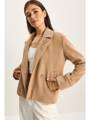 Bianco Lucci Camel Kruvaze Yaka Astarlı Cep Detaylı Kaşe Kısa Ceket Kaban