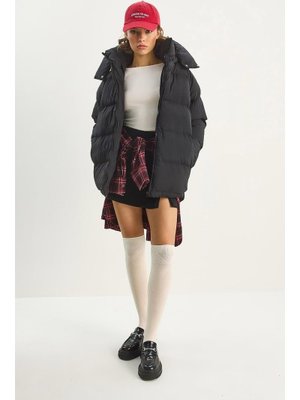 Bianco Lucci Siyah Kapüşonlu Cep Detaylı Astarlı Oversize Krinkıl Şişme Mont