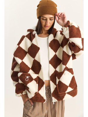 Bianco Lucci Kahverengi Kemik Baklava Desenli Astarlı Kapüşonlu Peluş Mont