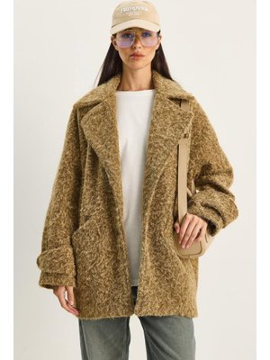 Bianco Lucci Camel Geniş Yaka Cep Detaylı Oversize Astarlı Buklet Kaşe Kaban