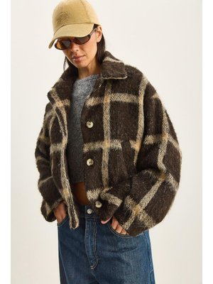Bianco Lucci Kahverengi Ekose Desenli Cep Detaylı Astarlı Şardonlu Triko Örme Mont