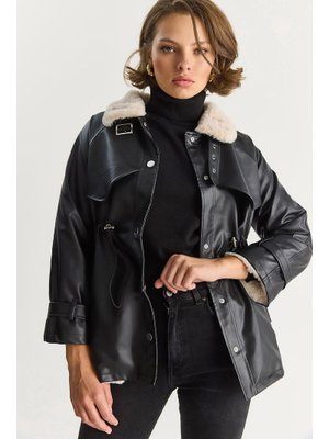 Bianco Lucci Siyah Gömlek Yaka İçi Kürk Belden Büzgü Ayarlamalı Cep Detaylı Suni Deri Mont
