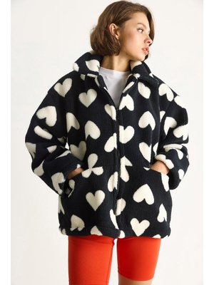 Bianco Lucci Ekru Kalpli Dik Yaka Cep Detaylı Astarlı Oversize Peluş Mont Siyah