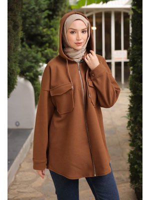 İmaj Butik Taba Kapüşonlu Fermuarlı Kaşe Ceket