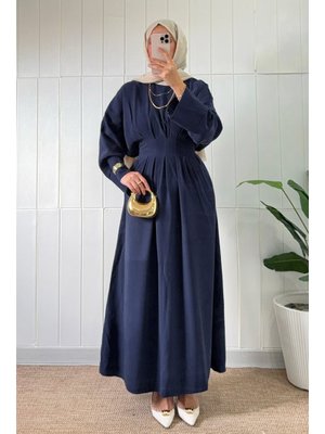 Salih Çelebi Lacivert Bel Pile Detaylı Elbise