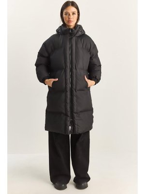 Bianco Lucci Siyah Cep Detaylı Astarlı Kapüşonlu Uzun Puffer Mont