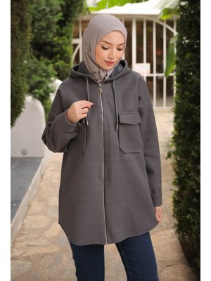 İmaj Butik Füme Kapüşonlu Fermuarlı Kaşe Ceket