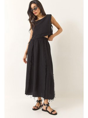 Bianco Lucci Siyah Beli Lastikli Etek Yandan Bağlama Detaylı Crop Müslin Alt Üst Takım