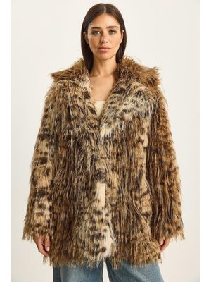 Bianco Lucci Kahverengi Leopar Desenli Yakalı Astarlı Premium Suni Kürk Kaban Bej