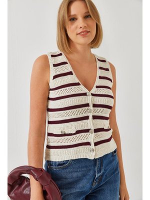 Bianco Lucci Ekru Bordo V Yaka Üç Düğmeli Çizgili Triko Yelek