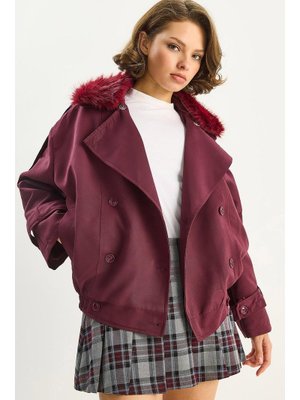 Bianco Lucci Bordo Beli Lastikli Cep Detaylı Çıkarılabilir Kürk Yaka Astarlı Kısa Trençkot