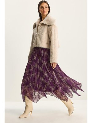 Bianco Lucci Patlıcan Ekose Desenli Kırışık Efektli Astarlı Midi Şifon Etek