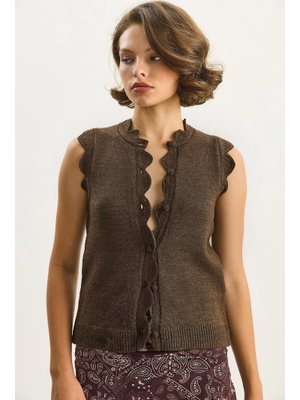 Bianco Lucci Acı Kahve Dantel Örgü Desenli Kaplama Düğmeli Triko Yelek