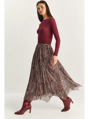Bianco Lucci Bordo Şal Desenli Asimetrik Kesim Astarlı Şifon Bohem Etek