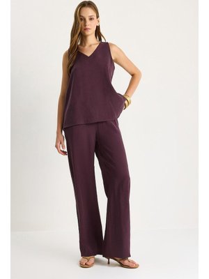 Bianco Lucci Patlıcan V Yaka Askılı Bluz Palazzo Pantolonlu Alt Üst Takım