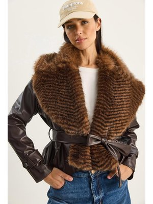 Bianco Lucci Acı Kahve Kürk Yaka Kuşaklı Astarlı Suni Deri Ceket