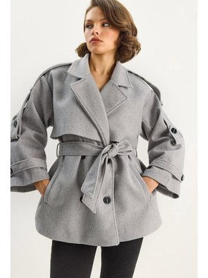 Bianco Lucci Gri Apolet Detaylı Astarlı Kuşaklı Cepli Kısa Kaşe Kaban