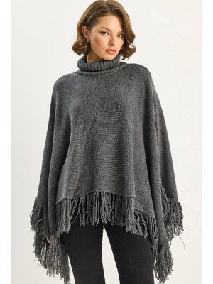 Bianco Lucci Antrasit Boğazlı Püsküllü Triko Panço