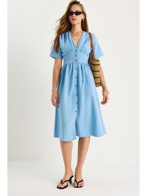 Bianco Lucci Bebe Mavisi V Yaka Bel Detaylı Düğmeli Kısa Kollu Viskon Keten Elbise