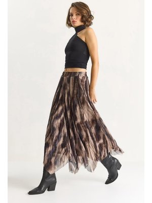 Bianco Lucci Kahverengi Bej Desenli Asimetrik Kesim Astarlı Şifon Bohem Etek
