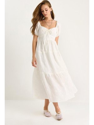 Bianco Lucci Beyaz Kendinden Çiçek Nakışlı Astarlı Müslin Elbise