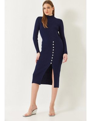 Bianco Lucci Lacivert Fitilli Düğmeli Triko Elbise