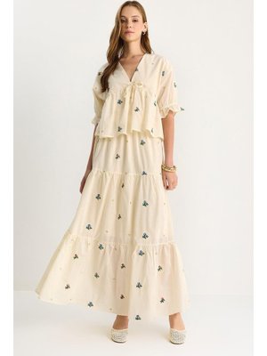 Bianco Lucci Taş Çiçek Nakış Detaylı Önden Bağlamalı Bluz Beli Lastikli Astarlı Etek Keten Takım